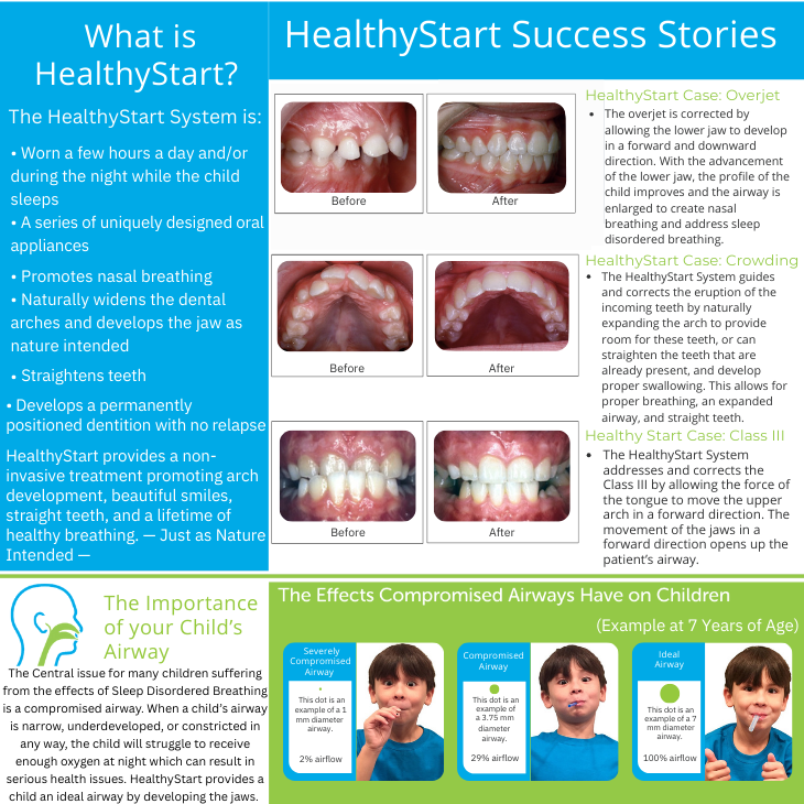 Healthy Start also supports better breathing and sleep. When a child’s jaw is not forming properly, it can limit airflow. That can affect sleep quality, which in turn can impact mood, focus, and behavior. Improving airway function helps children rest better and feel more energized during the day.