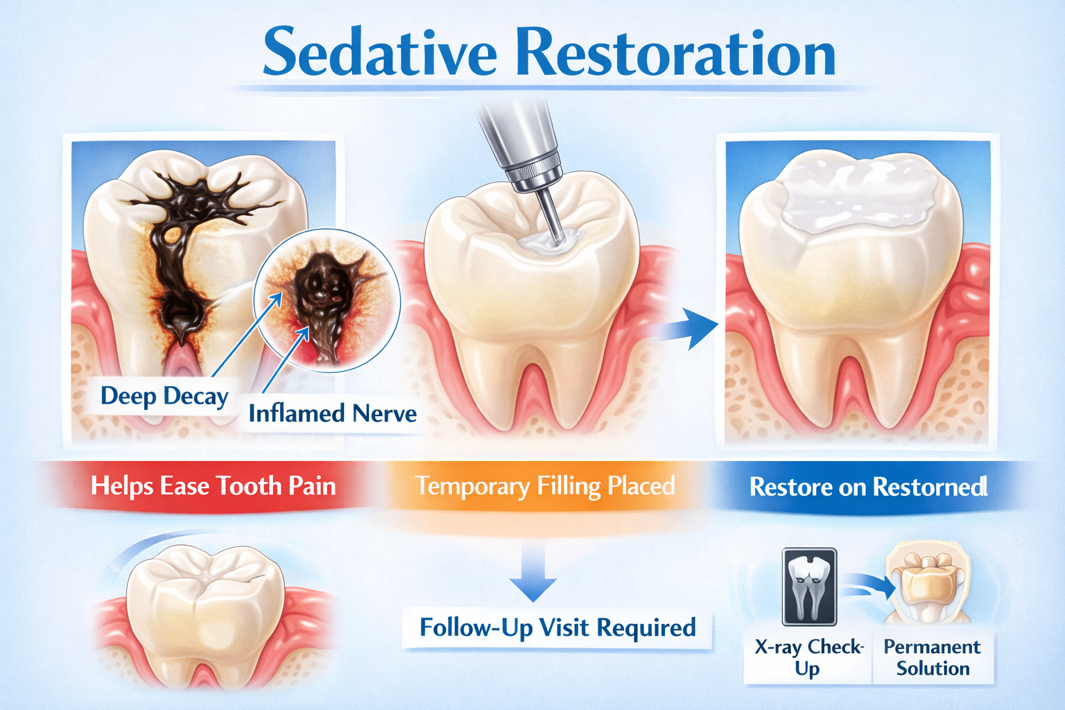Sedative restoration is a special type of filling used to calm irritated teeth. It is often chosen when decay is close to the nerve but infection has not yet set in.